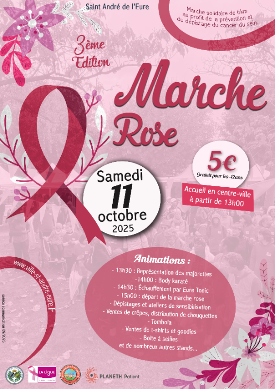 La ville de Saint-André-de-l’Eure a le plaisir de vous inviter à la 3ème édition de la Marche Rose, au profit de la prévention et du dépistage du cancer du sein, qui se tiendra :