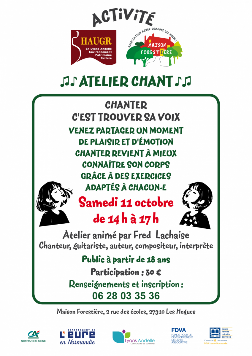 Dans le cadre de ses activités à la Maison Forestière, l'association Haugr a le plaisir de proposer un atelier chant animé par Fred Lachaise, chanteur, guitariste, auteur, compositeur, interprète, membre de nombreux groupes pop rock, jazz, compos originales et reprises depuis 1980, vivant le chant comme un vecteur de bien-être et d'énergie.