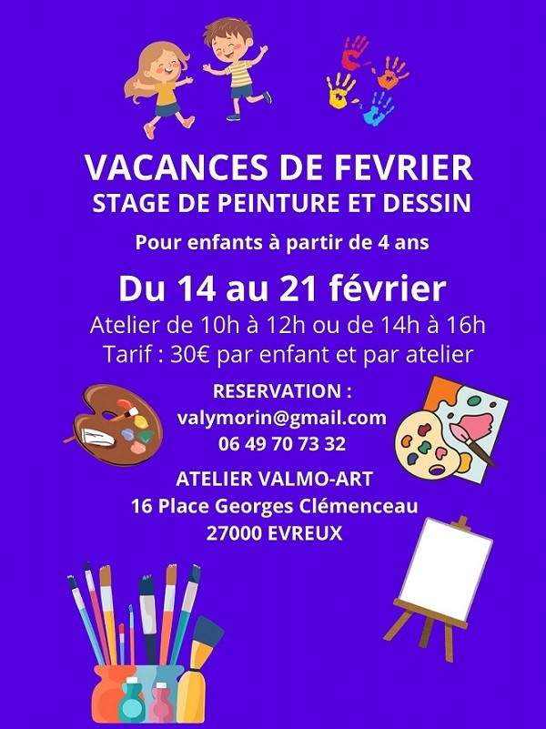 Pour les enfants à partir de 4 ans, Valérie propose d'accueillir vos futurs artistes en herbe. Le matériel est fourni, les enfants repartent avec leurs œuvres , le thème et la technique sont libres ( Acrylique sur toile, aquarelle, dessin, fusain, Posca, crayon de couleur, pastel etc. ... ) .