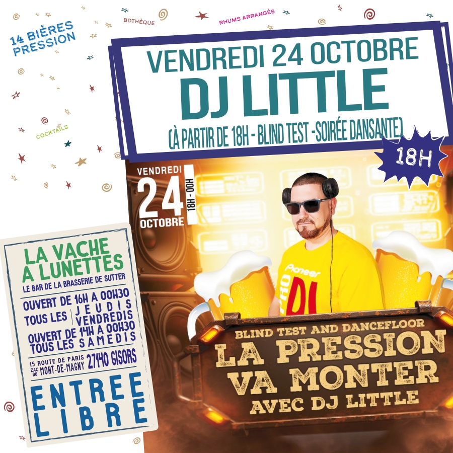 DJ Little animera la soirée avec un blind test à partir de 18h et fera danser le public de la Vache à Lunettes jusqu’à 0h30.