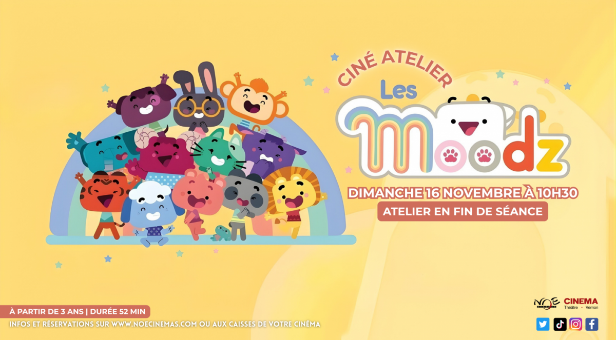 Les Moodz, la première série audiovisuelle soutenant le développement des compétences psychosociales des enfants de 3 à 5 ans, débarque au cinéma ! Plongez dans l'univers coloré de Youpi, Chocotte, Bisou, Furax, Snif … Des épisodes inédits à découvrir en famille grâce à des séances adaptées de 50 minutes pour les tout-petits (son modulé et lumière tamisée), pour apprivoiser tes émotions tout en douceur.