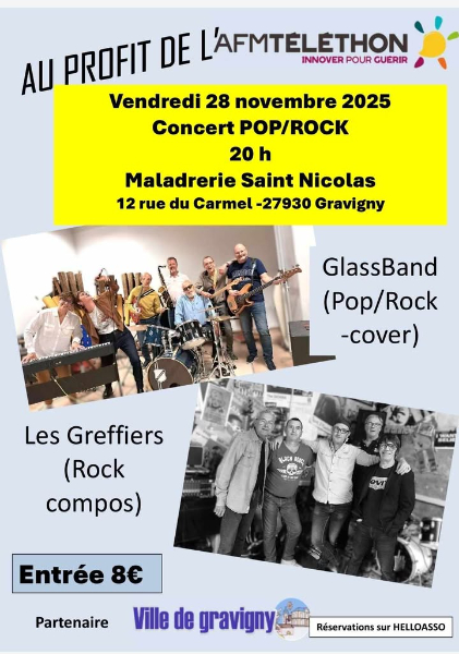 Pour ce concert au profit de l'ALM téléthon, le Trot Cœur d'Evreux a invité non pas 1 mais 2 groupes à venir se produire en concert à la Maladrerie Saint-Nicolas : Les Greffiers et du groupe Les GlassBand. Entrée 8 €