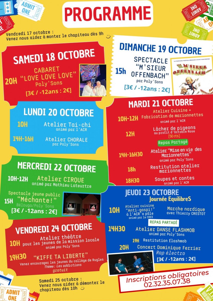 Du 17 au 25 octobre 2025, l'Association Culturelle Rugloise, la Compagnie du Bélouga et la Compagnie Poly'Sons vous proposent un festival itinérant sous chapiteau, place de la liberté à Rugles. Inscriptions obligatoires : 02 32 35 07 38.