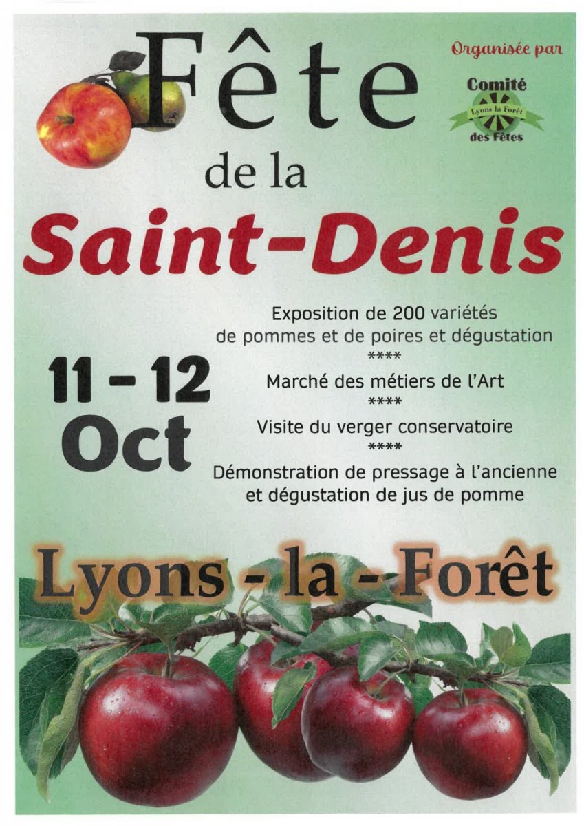 Dans le cadre de la fête de la Saint-Denis à Lyons-la-Forêt, l'association pomologique de Haute-Normandie et le comité des fêtes organisent une exposition de 200 fruits de variétés anciennes dans le grenier de la halle.