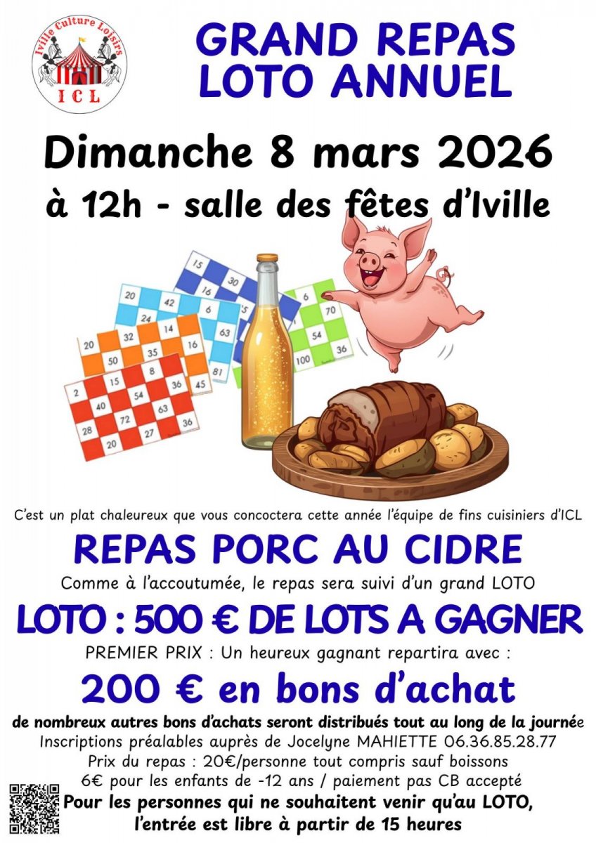 Comme chaque année depuis trois décennies, Iville Culture Loisirs organise son incontournable repas-loto. Au menu, un savoureux porc au cidre préparé par toute l’équipe, avec des produits locaux, suivi d’une partie de loto animée.