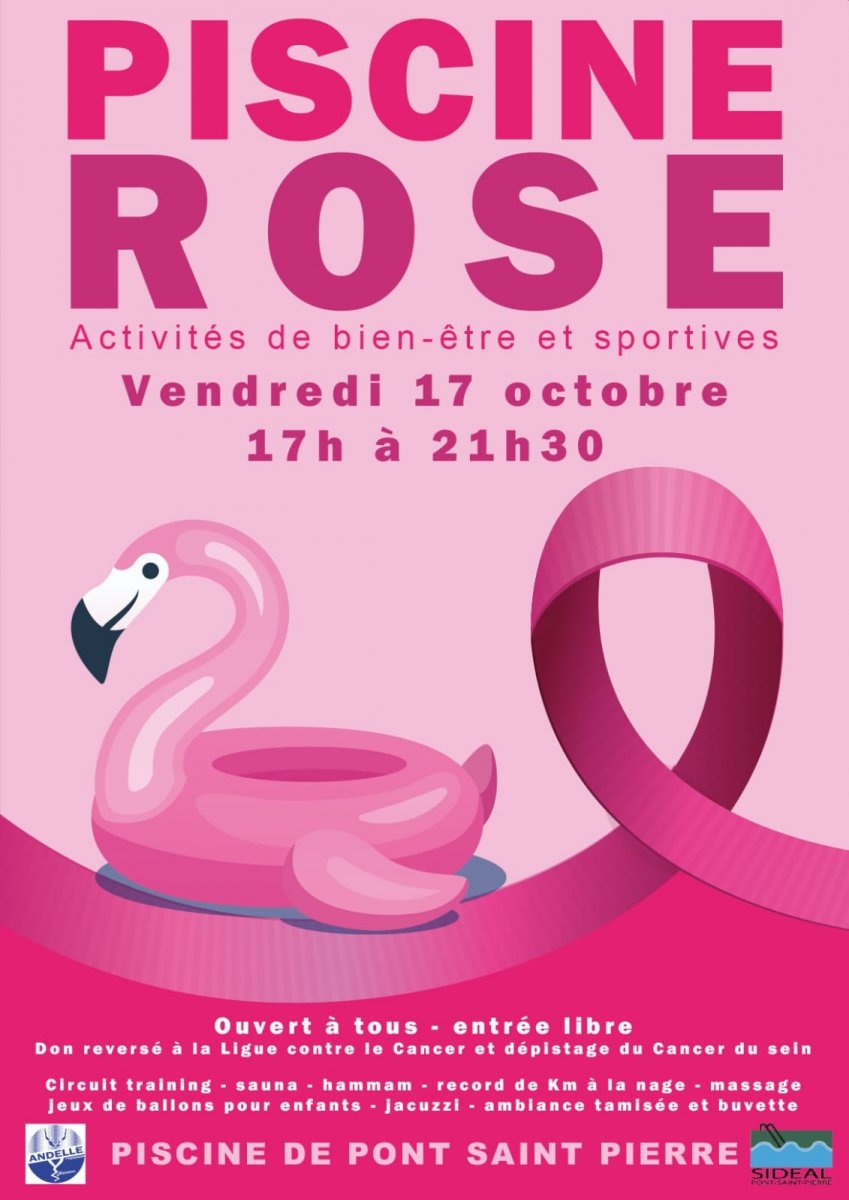 Vendredi 17 octobre, à l'occasion d'octobre rose, le SIDEAL vous propose de participer à l'évènement "La Piscine en Rose", à la piscine de Pont-Saint-Pierre.