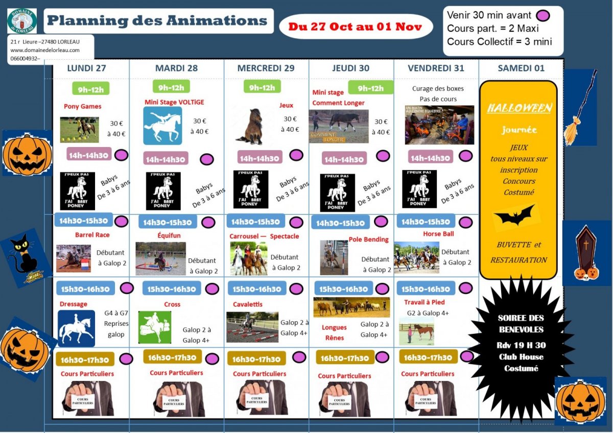 Au programme : pratiques équestres, promenades, mini-stage voltige pour débutants , travail à pied, saut d'obstacle, dressage, jeux... (programme ci-dessus).