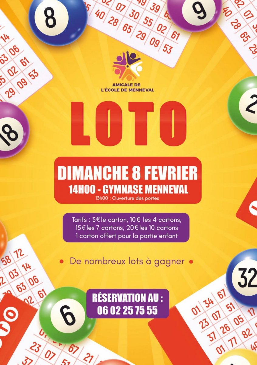 Organisé pour l'Amicale de l'École de Menneval. De nombreux lots à gagner.