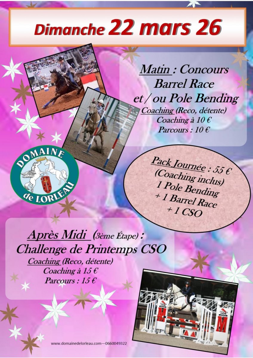 Pack Journée : 55 euros (coaching inclus) 1 Pôle Bending, 1 Barrel Race et 1 CSO