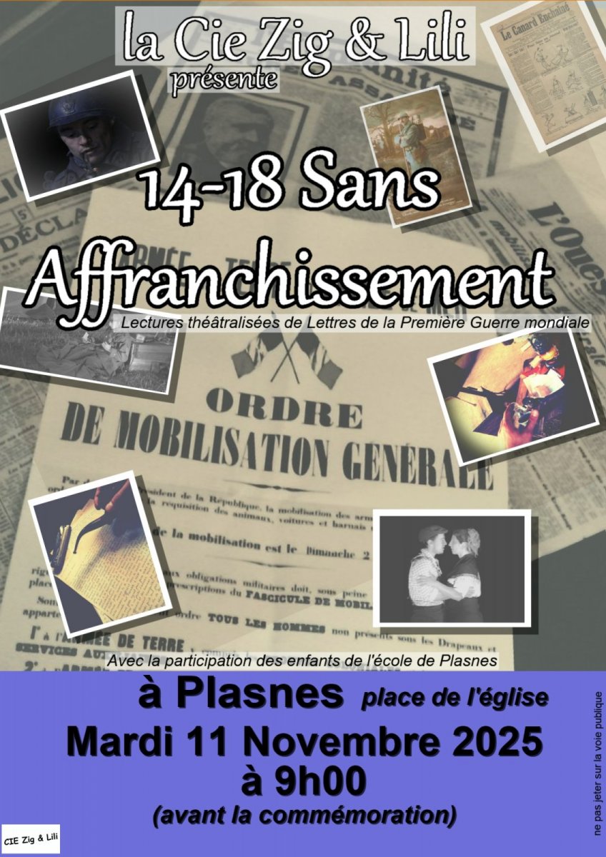 Lectures théâtralisées de lettres de la Première guerre mondiale, par la Cie Zig & Lili, avec la participation des enfants de l'école de Plasnes. Suivi de la commémoration.