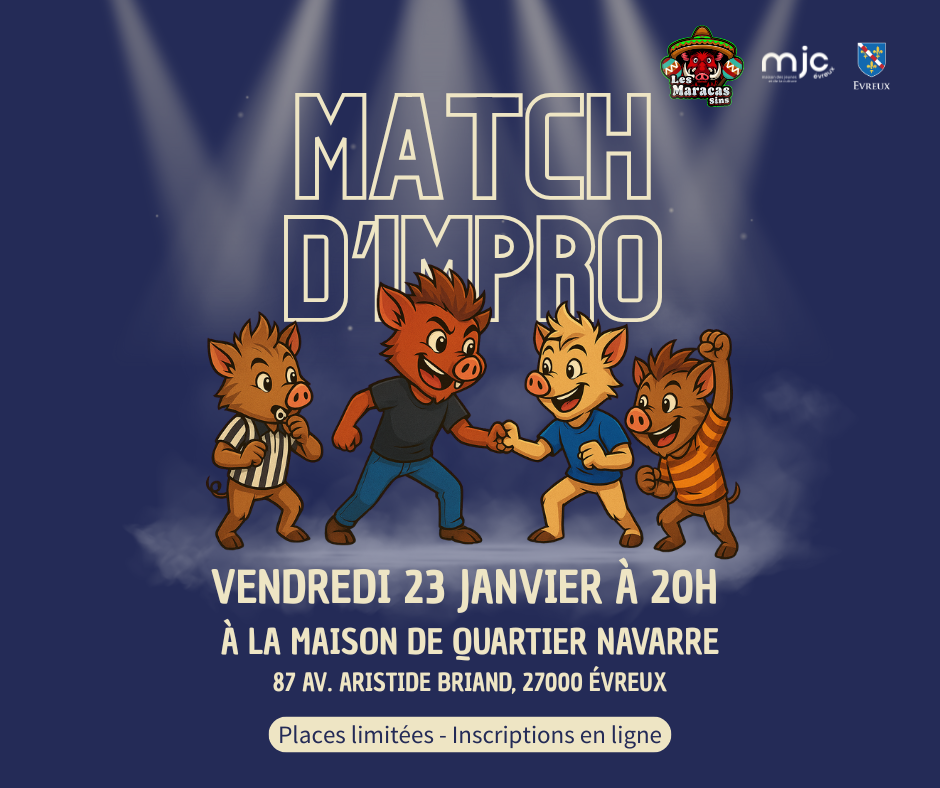 Le groupe de théâtre d'impro de la MJC 'LES MARACASSINS', coaché par Mayeul Duval, vous attend avec impatience pour ses cabarets d'impro. Attention, le spectacle se déroulera à la Maison de Quartier Alain Nogarede, 87 avenue Aristide Briand. Entrée libre tout public.
