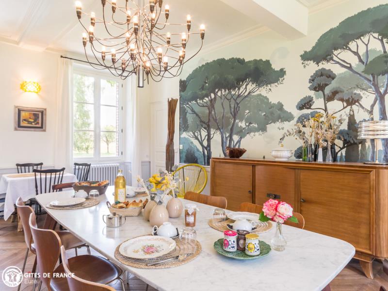 Au coeur du vert Vexin Normand, suivez la petite vallée de la Bonde jusqu'à Chauvincourt puis ce superbe domaine : dès le portail d'entrée, vous serez sous le charme du lieu, ancien corps de ferme avec sa maison de maître toute vêtue de vigne vierge, converti en une maison d'hôtes à la fois paisible et chaleureuse, hors du commun. Sandrine a su créer une ambiance personnelle autour de meubles et objets de famille ou collectionnés au fil des années comme ces pièces et luminaires design, mêlés à de belles matières naturelles, bois, rotin, cannage ou raphia et au caractère de cette maison de maître. Le tout avec un sens du détail, du confort et de l'accueil, autre signature du domaine. En couple ou en famille, vous y serez bien, entre l'espace spa et salle de sport à votre disposition, le salon "pop" avec jeux, bibliothèque et piano, les espaces détente et jeux côté jardin, et, chaque matin, un petit-déjeuner gourmand autour de bons produits locaux soigneusement sélectionnés.