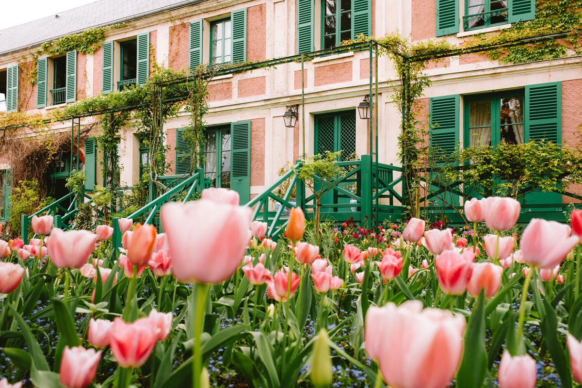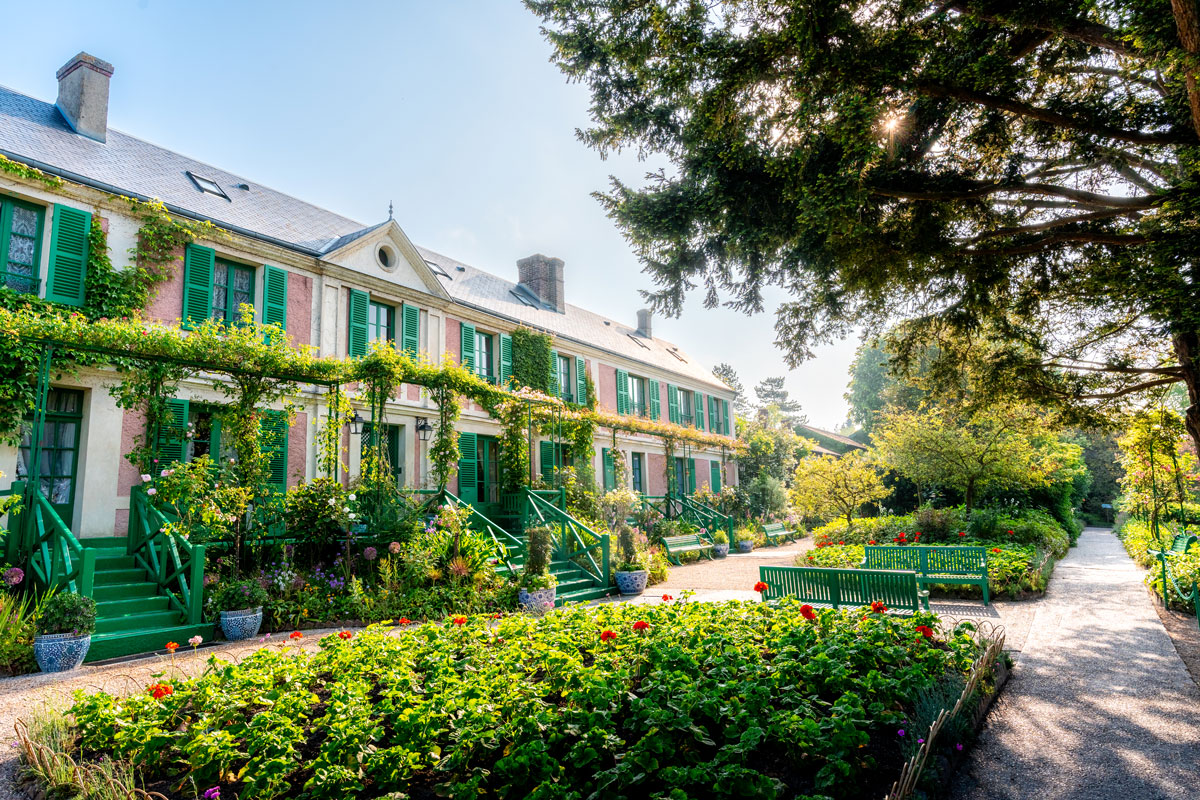 C’est ici, dans l’Eure en Normandie qu’il a choisi de s’installer pour réaliser son plus grand tableau. S’il connait d’autres lieux comme Honfleur et sa relation étroite avec Eugène Boudin, Claude Monet a un véritable coup de foudre pour le village normand à proximité de Vernon. L’artiste a façonné ses jardins comme un véritable chef-d’œuvre. Il créa également, en contrebas de sa propriété, un « jardin d’eau ». Pour cela, il ira jusqu’à détourner le petit cours d’eau, le Ru, pour alimenter l’étang qui donnera naissance aux célèbres bassins aux nymphéas. Devant la maison du peintre toutes sortes de fleurent arborent des couleurs de saison et s’harmonisent avec les volets verts et le crépi rose.