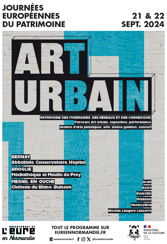 Depuis 2019, le Département de l’Eure associe un lieu patrimonial à une proposition artistique contemporaine. En 2024, ce sont 5 artistes d’art urbain qui présenteront leurs fresques autour de Bernay, Broglie et Mesnil-en-Ouche. Venez découvrir les œuvres de Monkeybird, Astro, Madame, Ardif et EvazéSir dans 6 lieux d’exception spécialement ouvert pour les Journées Européennes du Patrimoine 2024 :