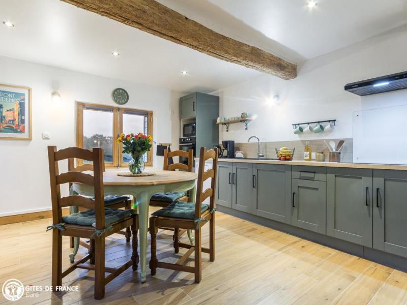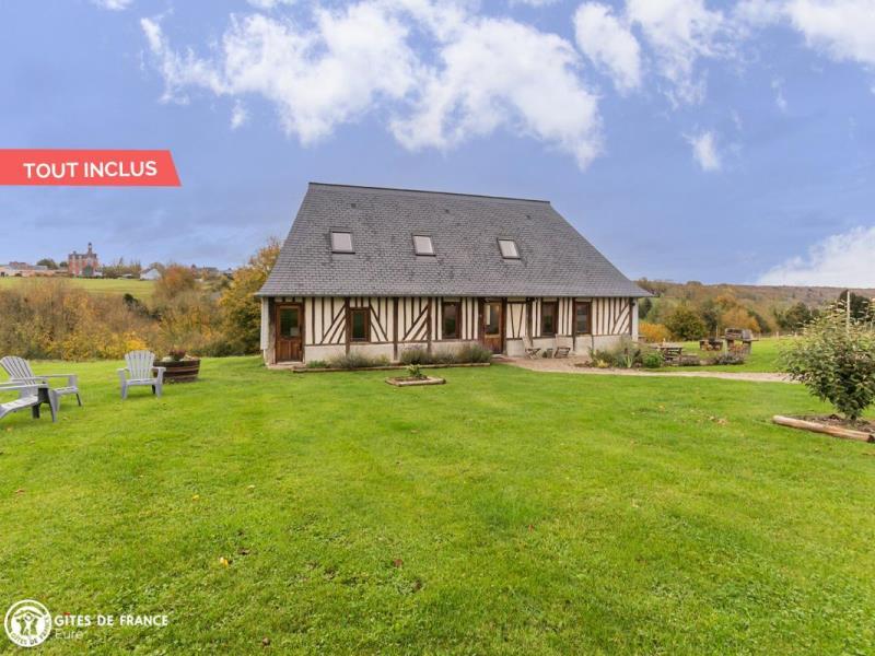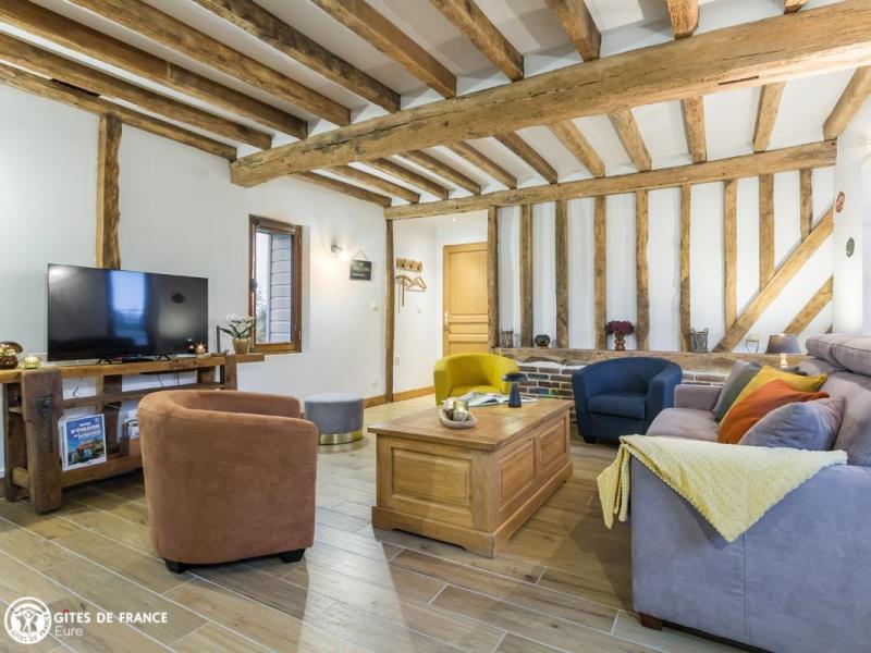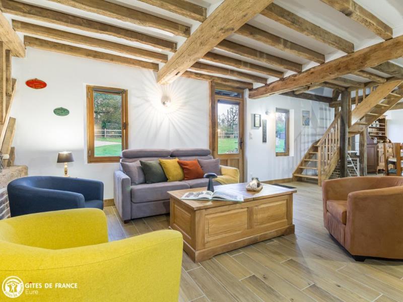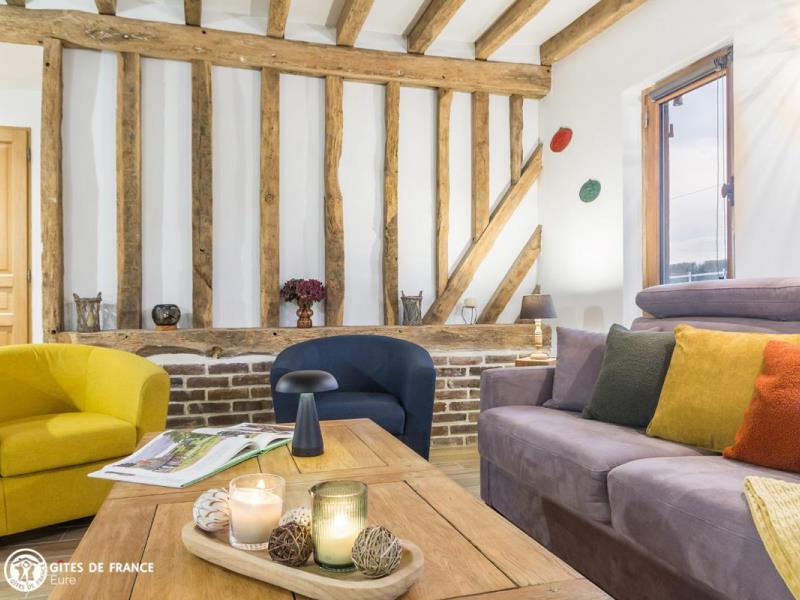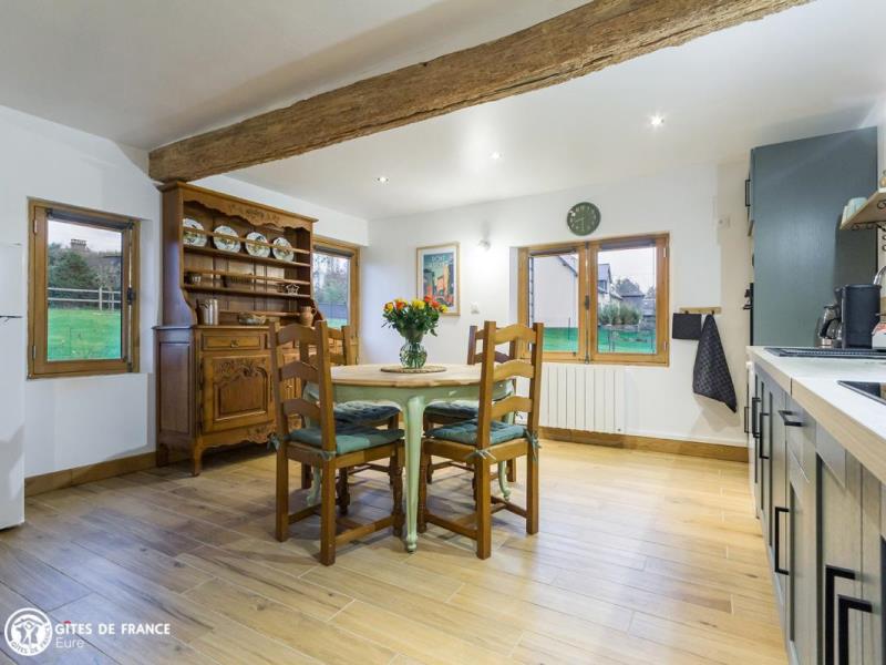 Dans une adorable région qui fleure bon la Normandie, de jolies petites routes sinueuses entre herbages et forêt mènent au gîte de la Giroterie. Vous serez vite sous le charme de cette maison traditionnelle à colombages sur son vaste jardin tout à vous qui borde une petite vallée ; tout autour, vue sur la forêt, les herbages avec chevaux et en face le joli village. C'est un vrai cocon dans lequel vous vous sentirez vite comme chez vous, joli contraste entre le passé, avec poutres anciennes et meubles de famille ou chinés, et le présent, avec jolies couleurs, matières naturelles et détails raffinés, l'ensemble pensé pour votre confort et très bien équipé. Amandine a pensé à vos loisirs, outre les superbes balades à faire dans les petits chemins tout autour : parties de fléchettes, de quilles ou de pétanque, cache-cache dans le jardin ou visite aux poules voisines, au choix. Ne ratez pas la visite de Pont Audemer à 7 km, petite Venise normande que vous pouvez visiter en canoë !
