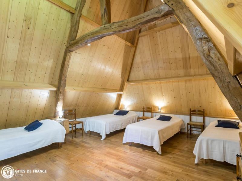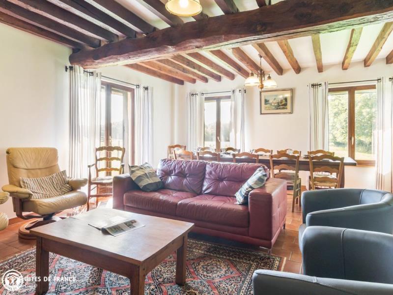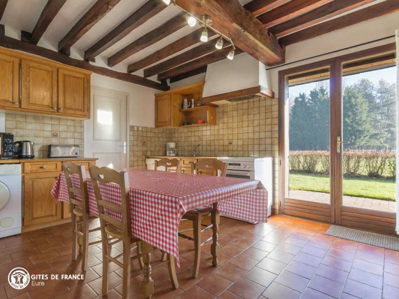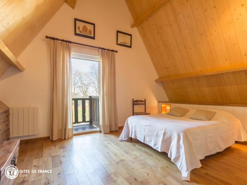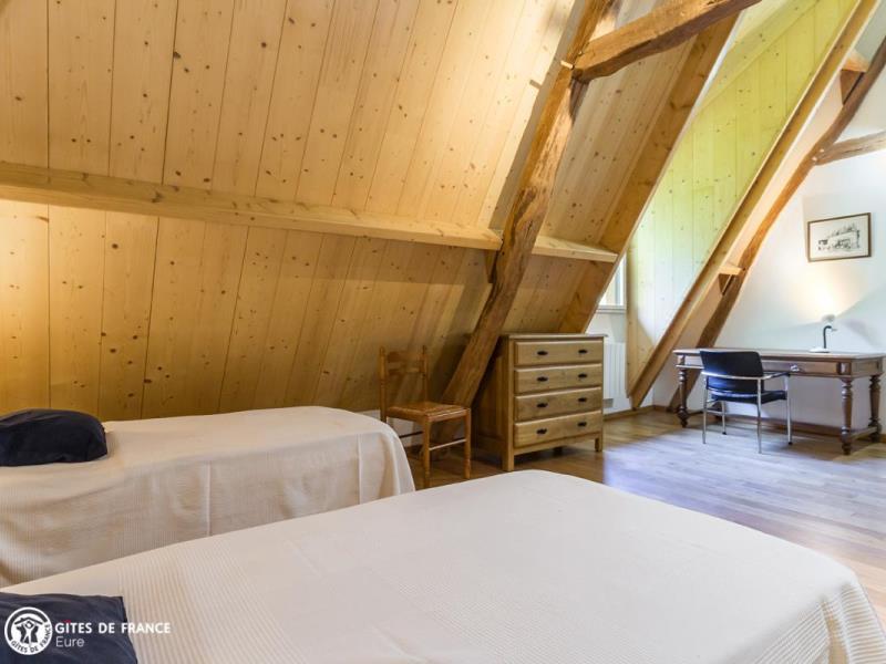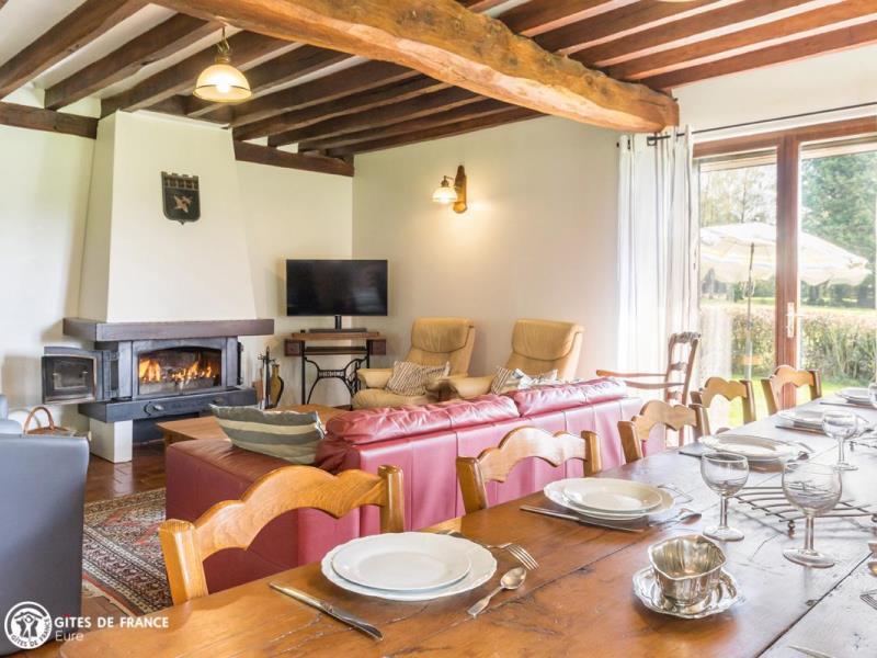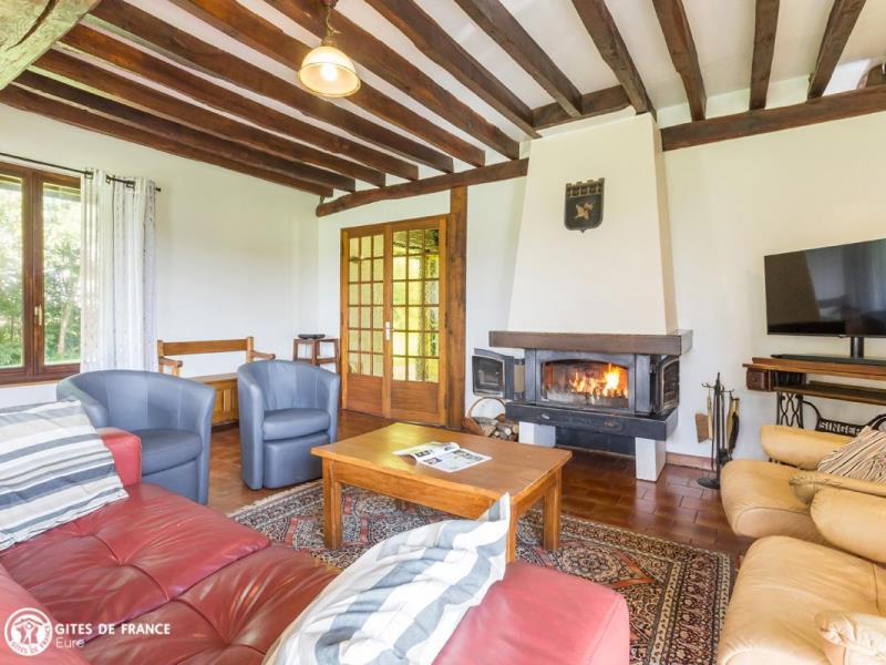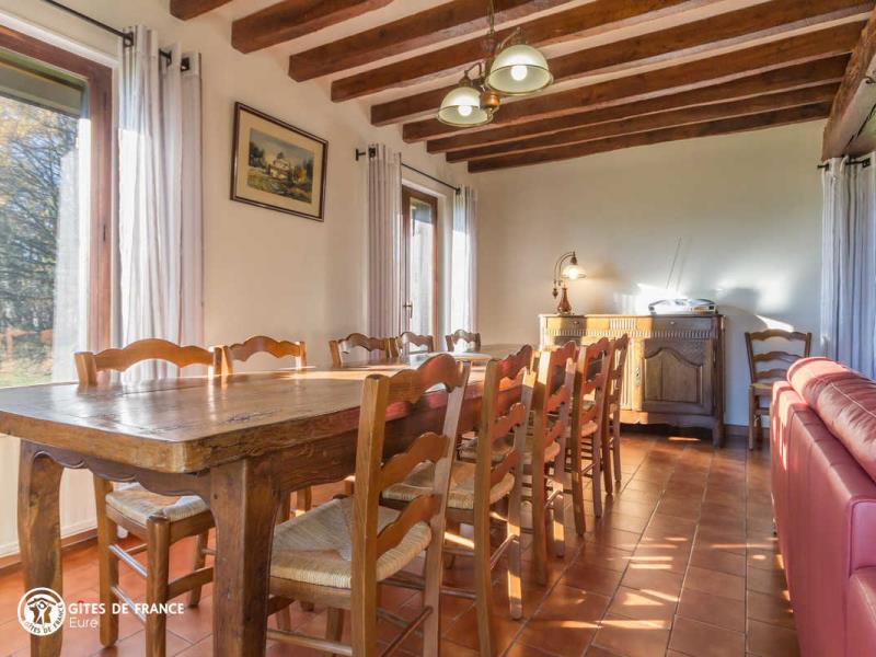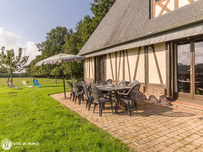 Au détour de petites routes de campagne dans les bois, cette jolie maison à pans de bois a fière allure. Typiquement normande, elle s'offre au regard dans un environnement champêtre, fait de bois et de prairies. Spacieux, bien aménagé, ce gîte propose un bel équipement et très bon confort., dans une ambiance "maison de campagne" aux jolis meubles traditionnels, dans des teintes claires. Calme et sérénité des lieux sont une invitation à la détente, sur la terrasse bien exposée pour des repas vraiment sympas avec toute votre tribu, comme au salon près de la chaleur d'un bon feu de bois. L'environnement est superbe, dans un petit coin de campagne vraiment tranquille de cette région du Roumois, néanmoins proches de lieux à ne pas rater comme le château du Champ de Bataille ou le village adorable du Bec Hellouin (2 km chacun) ou la vallée de la Seine et de superbes panoramas à 15 km.