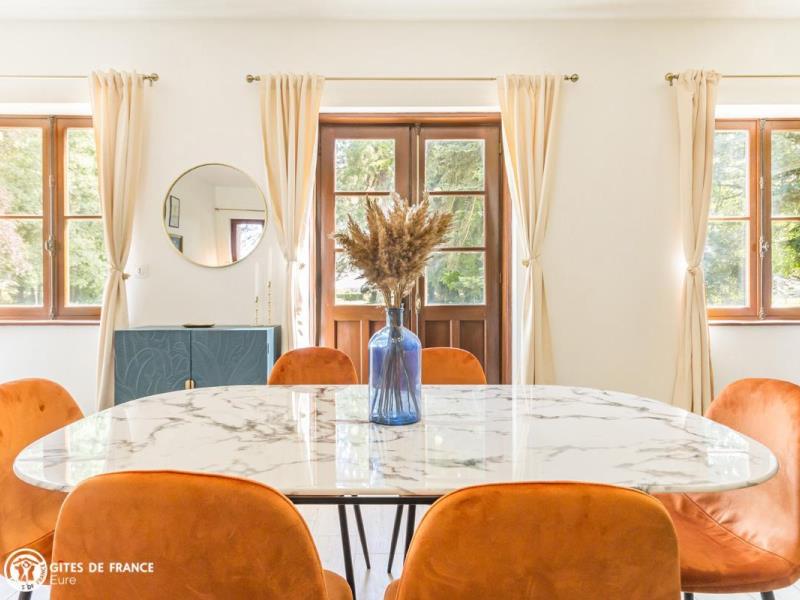 Au fil des petites routes qui sillonnent le Roumois, région attachante aux jolis paysages entre forêts, vallées de Risle, Oison et Seine et champs cultivés, le domaine de Lenteuil vous accueille. Acollé à l'élégant manoir familial du XVIIIe, cette maison de vacances en fut la chapelle, qui lui donne cette architecture originale, puis la cuisine, d'où le potager, sorte de fourneau ancien toujours présent dans le séjour. Pleine de charme avec ses fenêtres rondes qui ouvrent sur le parc, vous en aimerez l'ambiance claire et toute en douceur de jolies chambres qui font la part belle aux matières naturelles, comme de la pièce de vie lumineuse et colorée au look très actuel. Côté confort tout est là et bien pensé. Rien que pour vous, un jardin à l'écart avec tout le mobilier voulu pour repas ou repos, tout en profitant également du parc aux arbres majestueux. Un chemin bordé d'arbres vous promet de belles balades à travers les champs, tous bleus de fleurs de lin en saison.
