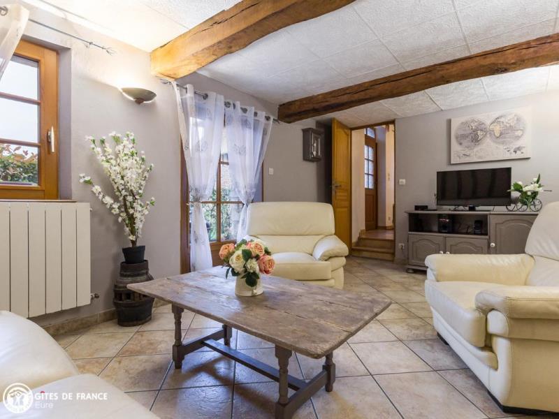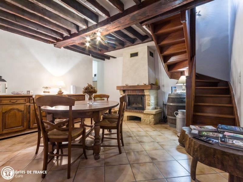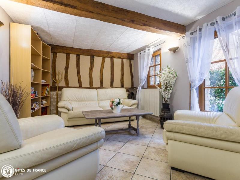 Venez prendre un bon bol d'air et de nature à la Ferme de la côte, à la confluence de l'Eure et de la Seine, en bord de forêt de Bord et à deux pas des étangs de cette magnifique boucle de Seine. Passez le superbe portail d'entrée et faites un plongeon dans le temps : les origines de cette propriété, ancienne ferme, datent du XVIIe siècle et l'ensemble a beaucoup de charme avec ses pierres blanches, briques et colombages. Tout comme ce gîte, restauré et aménagé par Jean-Marc qui a conservé à cette maison toute son âme : vous y retrouvez pans de bois et poutres apparentes, le vieux four à pain et son mur de briques, ainsi que du mobilier chiné dans les brocantes du coin ou réinventé grâce aux trouvailles maison. Le résultat est sympa et accueillant, confortable et très bien équipé. Votre hôte connaît la région parfaitement et se fera un plaisir de vous conseiller pour vos sorties. Visite patrimoine à Pont de l'Arche ou Poses, nature côté réserve ornithologique ou ludique à Biotropica.