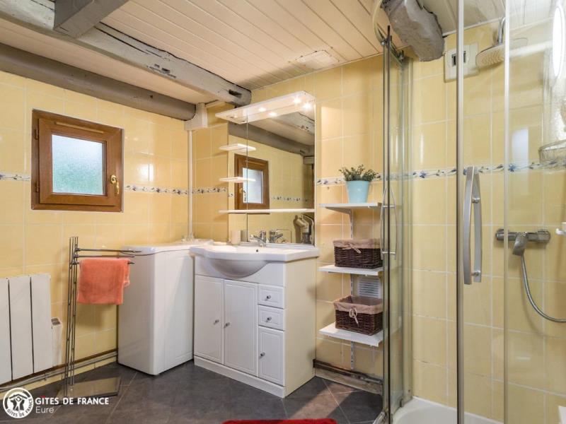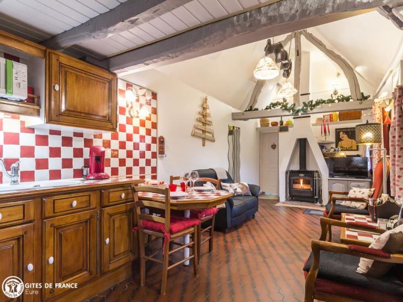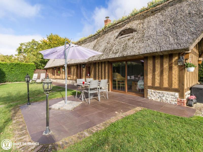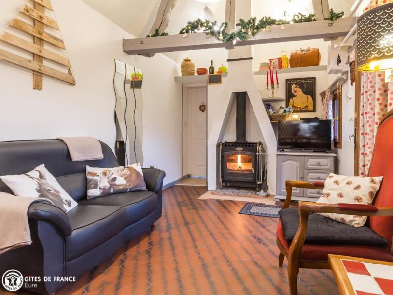 Proche des méandres de la Seine, au calme dans la campagne, cette vraie chaumière arbore fièrement ses iris sur son toit en chaume. Cosy, chaleureuse, bien aménagée et équipée, elle sait recevoir, même par temps frais avec sa cheminée. La grande chambre offre une vue sur le jardin très agréable avec sa terrasse et son barbecue, où vous pourrez croiser poules et chevaux. Un cadre de détente idéal où Marie et Jacques-Etienne sauront vous faire profiter de leur connaissance de la région. Avis aux amateurs d'équitation: le gîte propose également la possibilité d'un accueil équestre, en paddock et en boxes. Les amateurs de randonnée apprécieront quant à eux la proximité avec le GR23, situé à moins d'1 km. A pieds ou à cheval, les environs valent détour, vous y découvrirez le Parc Naturel Régional des Boucles de la Seine Normande et ses paysages à couper le souffle.