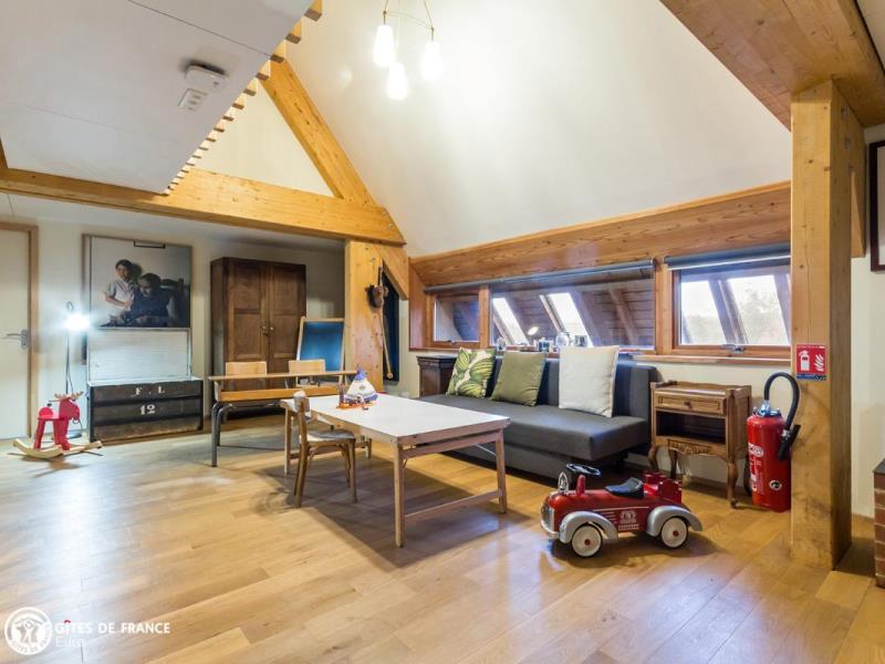 Cette superbe maison d'architecte, bioclimatique, labellisée Ecogîte et Panda, au look très contemporain donne le ton dès l'arrivée : entrez, vous êtes tout de suite dans l'ambiance chaleureuse et conviviale d'un lieu où il fait bon vivre, où l'on se sent tout de suite bien. Spacieux et parfaitement conçu pour un séjour en famille, entre amis ou en petit groupe de travail, vous serez sous le charme de ce gîte où se mélangent design et matériaux modernes, mobilier vintage inspiré fiftie's, objets et vaisselle récup' ou chinés, dans une atmosphère insolite, créative et artistique, avec photos et œuvres d'art et une conception originale et ludique. Un véritable ressenti de bien-être émane de cette maison éco-responsable à l'ossature bois, très lumineuse et toute ouverte sur le jardin grâce à de généreux vitrages. On se sent vraiment comme à la maison, avec plein de loisirs, dedans comme dehors, une incroyable bibliothèque, dvdthèque, des jouets pour les petits et une cuisine au top !