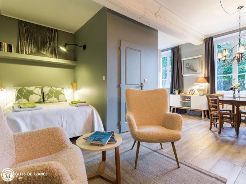 Dans un joli village typique de la vallée de Seine, le Clos du Bourgage est une élégante maison bourgeoise pleine de charme, parfaite pour un séjour de détente. Dès l'arrivée, vous êtes dans l'ambiance de ce lieu, entre authenticité et douceur de vivre, où l'on se sent bien, comme à la maison. L'atmosphère est vraiment chaleureuse : on y retrouve tout le caractère de cette bâtisse ancienne avec ses parquets anciens, cheminées avec trumeau, pans de bois, grandes fenêtres, sublimé par une déco qui a su mêler avec brio les meubles anciens de famille, de belles matières et des pièces contemporaines pour un résultat chic et très actuel ... sans oublier les petites attentions de Fabrice, aux petits soins pour faire de votre séjour un moment unique. La conception de la maison en 3 modules permet à chacun de profiter de son indépendance, avec un bel espace de vie commun pour se retrouver comme dans le salon près du poêle à bois. L'espace sauna est un vrai plus, tout comme le très joli jardin.