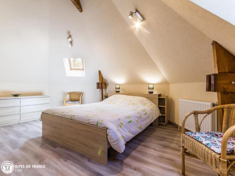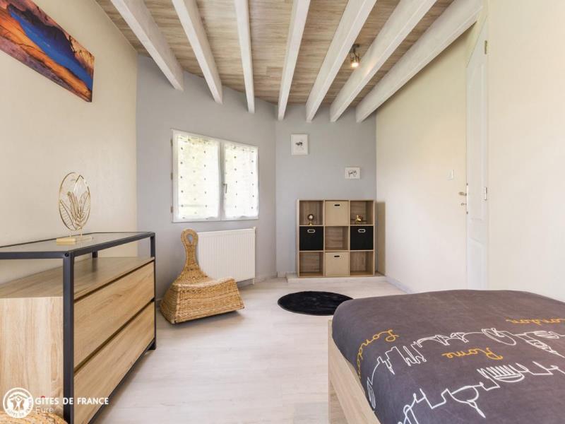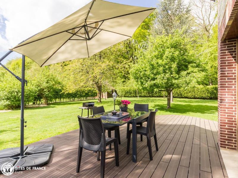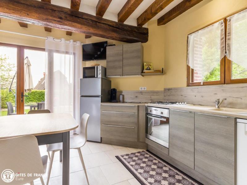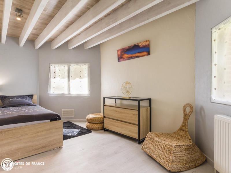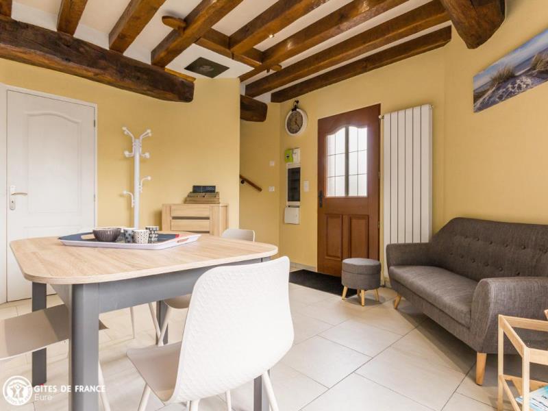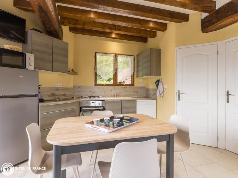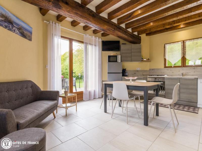 Offrez vous un séjour insolite dans un colombier ! Tout en briques, pierre blanche et octogonal, il a beaucoup d'allure avec sa belle terrasse au milieu de son vaste jardin planté de pommiers, superbe écrin. En fond de cette carte postale, la forêt domaniale de Montfort qui peut vous offrir la surprise de la visite d'un chevreuil au fond de votre jardin mais surtout plein de balades au travers de ses pins et épicéas, comme dans les petits chemins alentours. Un peu plus loin, la vallée de la Risle ponctuée de jolis petits bourgs où faire ses courses vous mène à Pont Audemer, petite Venise normande très typique et pleine de caractère et pourquoi pas jusqu'à Honfleur et la côte, à seulement 40 minutes. L'intérieur du gîte est confortable et agréable, dans une ambiance actuelle aux jolies teintes pastel.