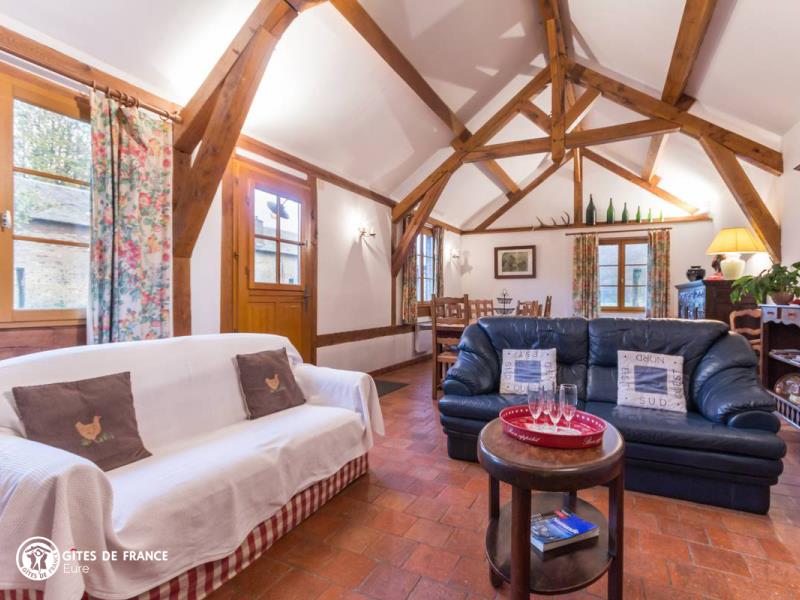 Catherine et Michel vous accueillent dans leur charmante longère décorée avec soin dans un esprit maison de campagne. Tomettes, poutres apparentes, murs en brique et meubles anciens donnent son cachet à cette maison complètement indépendante au joli jardin clos. Situé au cœur de la vallée de Seine, ce gîte vous fait également profiter de sa proximité avec les villages de Lyons-La-Forêt et Giverny, de quoi découvrir ces pépites de l'Eure. Pour les sportifs, de nombreuses randonnées s'offrent à vous, vers le célèbre Château Gaillard et ses panoramas à couper le souffle, par exemple. Le GR2, longeant la Seine, est également tout près. Juste à côté les propriétaires, agriculteurs, pourront vous faire visiter l'élevage de vaches allaitantes, où les veaux sont élevés "sous la mère".