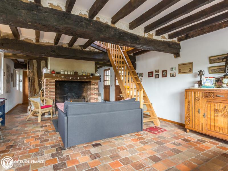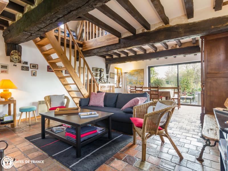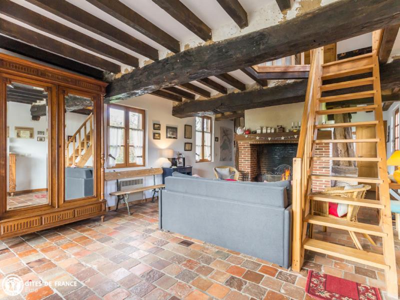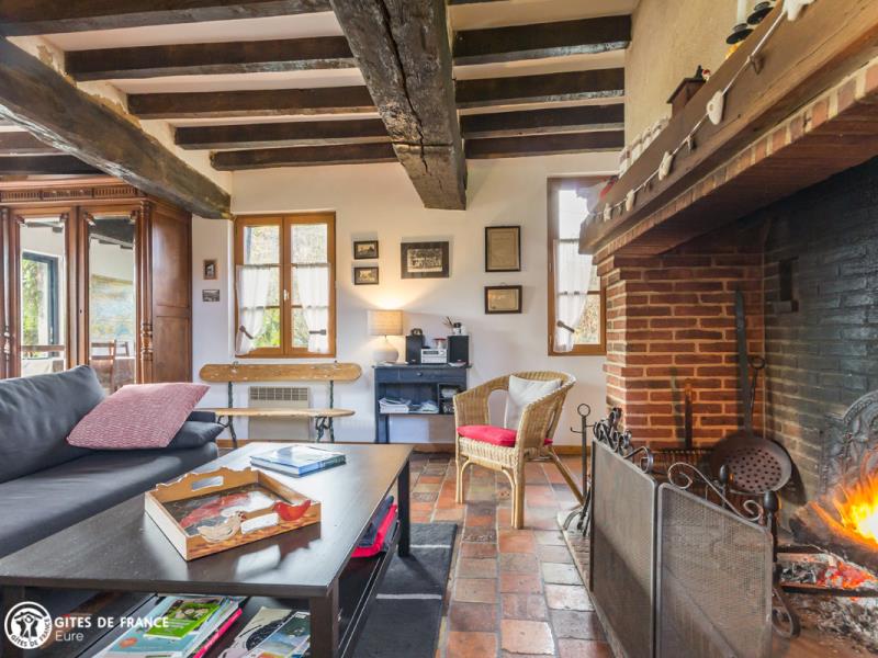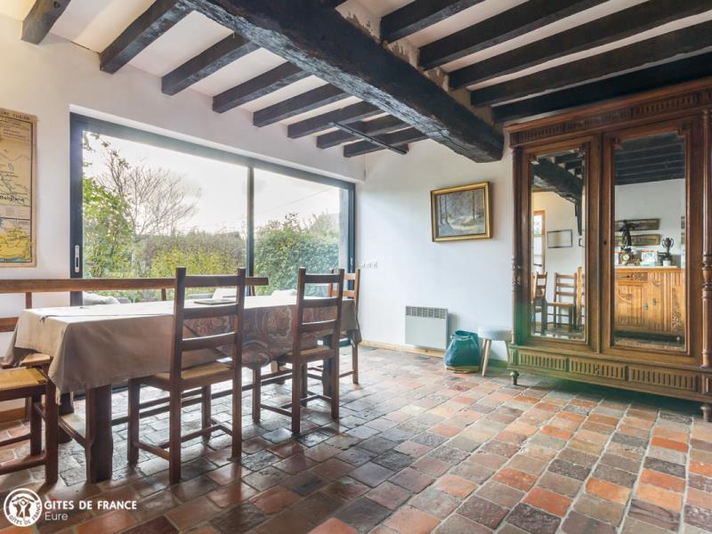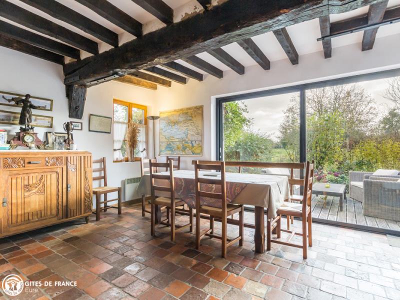 Au coeur du Roumois, cette superbe région qui borde les boucles de la Seine, se cache cette chaleureuse maison de vacances à colombages que les propriétaires ont restaurée de manière traditionnelle : pans de bois avec un remplissage de terre. C'est aujourd'hui un gîte très agréable avec beaucoup de caractère et un look rétro très sympa avec ses jolis meubles et objets anciens, de famille ou chinés : tomettes, poutres apparentes, murs en terre. Très chaleureux, il ouvre complètement sur l'extérieur, la terrasse et son vrai salon de détente, le jardin et les champs tout autour : une vraie carte postale normande ! Selon l'humeur du jardinier, vous apprécierez le jardin potager. Côté loisirs, une bibliothèque sympa pour petits et grands et plein de jeux de société, ou tout simplement de belles balades sur les petits chemins tout autour. Vous êtes tout près du Parc Naturel Régional des Boucles de la Seine Normande, avec plein de belles découvertes.