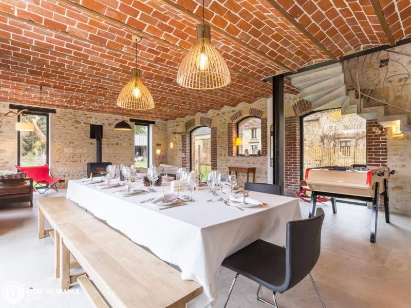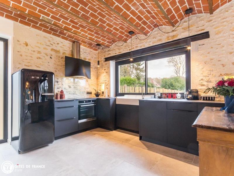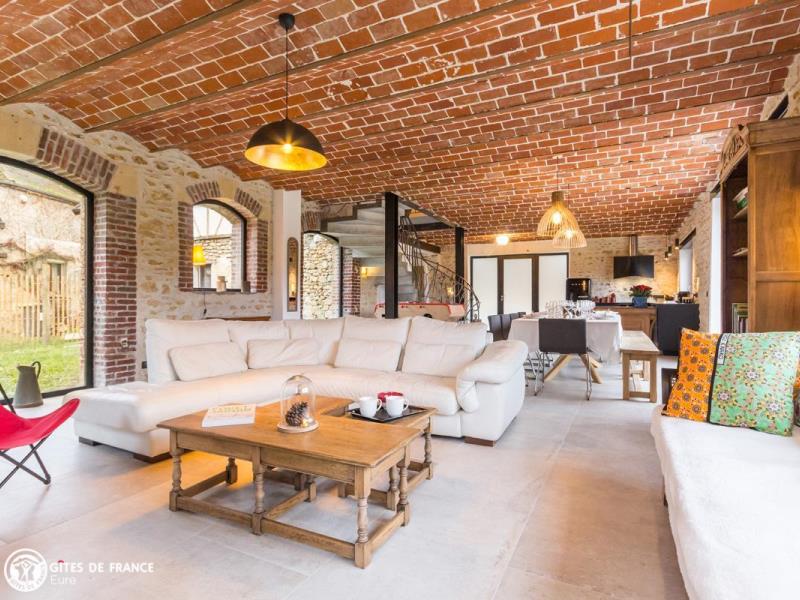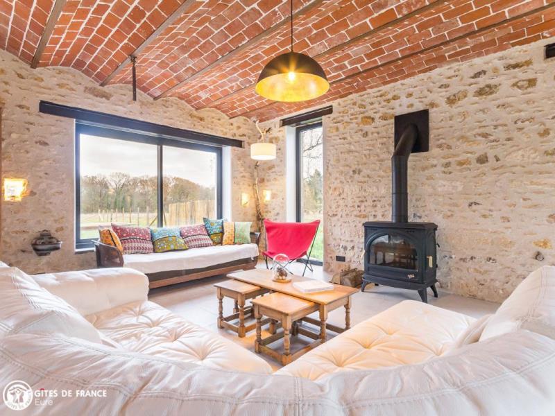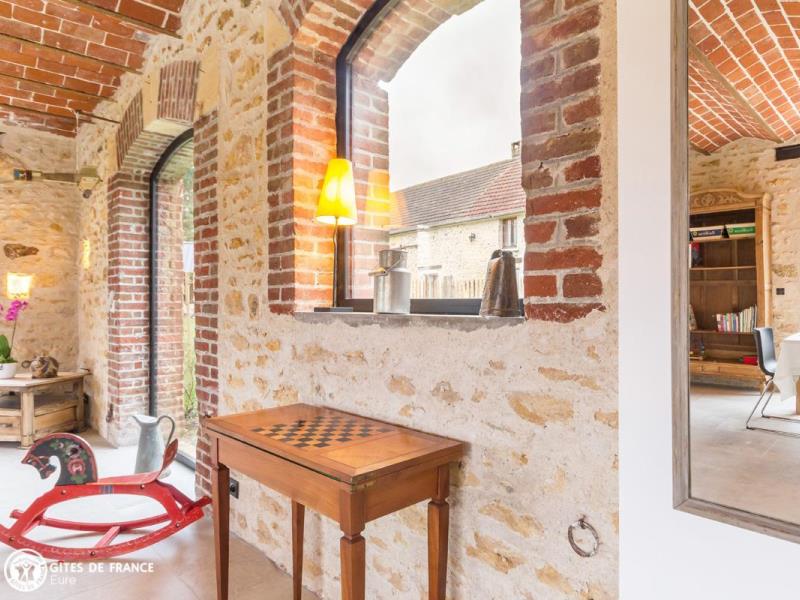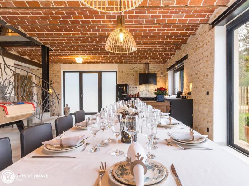 Dans un hameau bordé par la forêt et perché au dessus de la vallée de l'Epte, l'Etable du Bosc est un vrai coup de cœur, parfaite maison de vacances à la campagne pour les pauses vacances et week-ends avec toute sa tribu. Si cette ancienne étable a conservé quelques clins d'œil à cette ancienne vocation, abreuvoir, mangeoire, elle est aujourd'hui un lieu de vie contemporain, spacieux, élégant et plein de caractère, avec tout ce qu'il faut pour un séjour de détente en famille, entre amis. La déco est chaleureuse, mêlant la simplicité des pierres et boiseries apparentes à du mobilier ou des objets chinés ou résolument modernes comme ce superbe escalier. L'équipement de vacances est là : babyfoot, espace de jeux pour les petits, terrain de pétanque, mobilier de détente et jeux (fléchettes, badminton, quilles) dans un jardin clos qui ouvre sur les champs et la forêt en lisière de laquelle vous apercevrez peut être biches ou chevreuils. Piste cyclable à 1,5 km (Avenue London-Paris).
