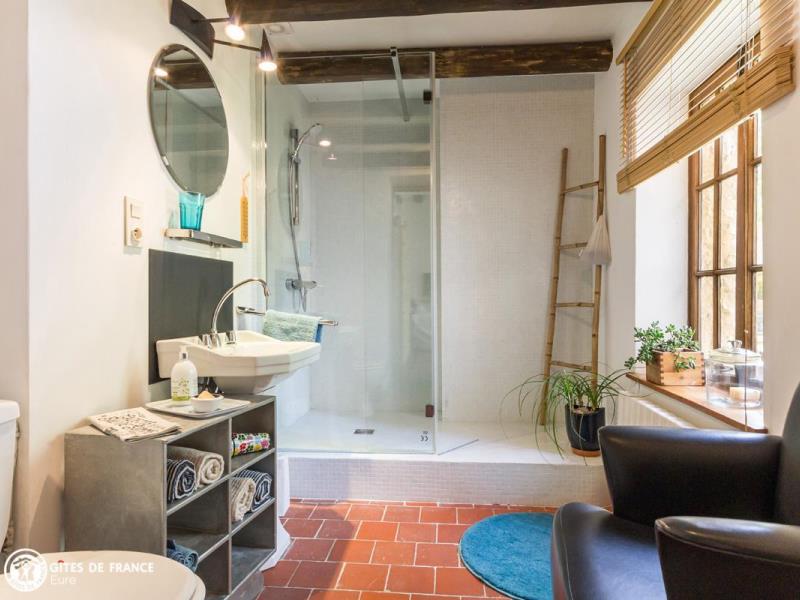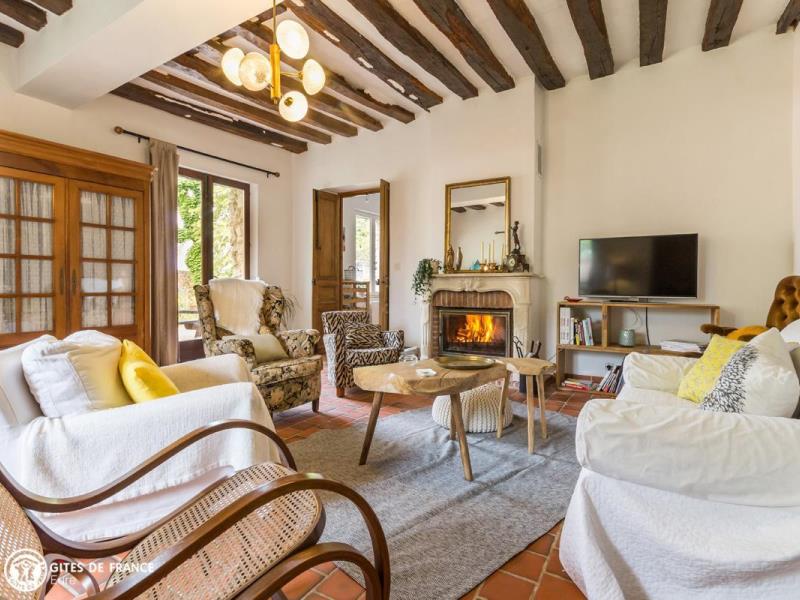 Dans le cœur historique d'un village des bords de Seine, cette élégante maison de vacances pleine a tout pour plaire. Vous aimerez son ambiance intimiste et chaleureuse, sa déco travaillée en toute simplicité : Sylvie a su au fil des ans sublimer le caractère de ce logis ancien en lui apportant tout le confort attendu aujourd'hui : pans de bois, tomettes et vieilles pierres résonnent joliment avec meubles et objets anciens, de famille ou chinés, d'esprit campagne ou design vintage. L'ensemble est confortable et spacieux, lumineux et bien équipé avec 3 salles de bains ou douche, et ouvre largement du côté du jardin coloré et clos derrière le superbe portail classé aux monuments historiques. Insolite, une vraie roulotte ancienne sera, aux beaux jours (15/04 au 30/09, sur demande en automne/hiver), une véritable pièce supplémentaire pour une sieste, un petit moment à l'écart ou une nuit originale ! Une balade d'un peu plus de 3 km vous mène au charmant village du Petit Andely.