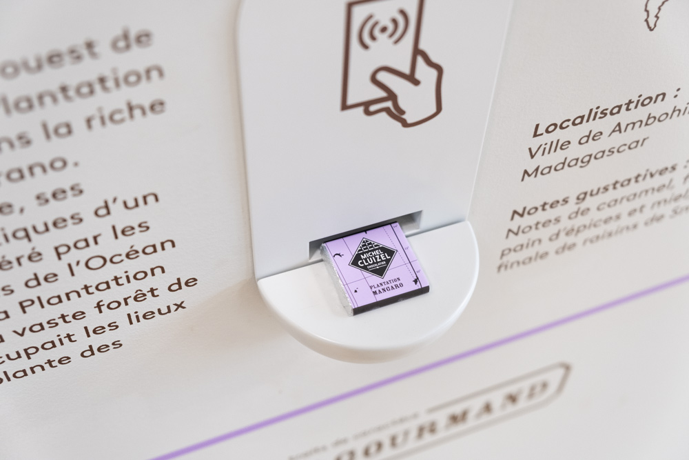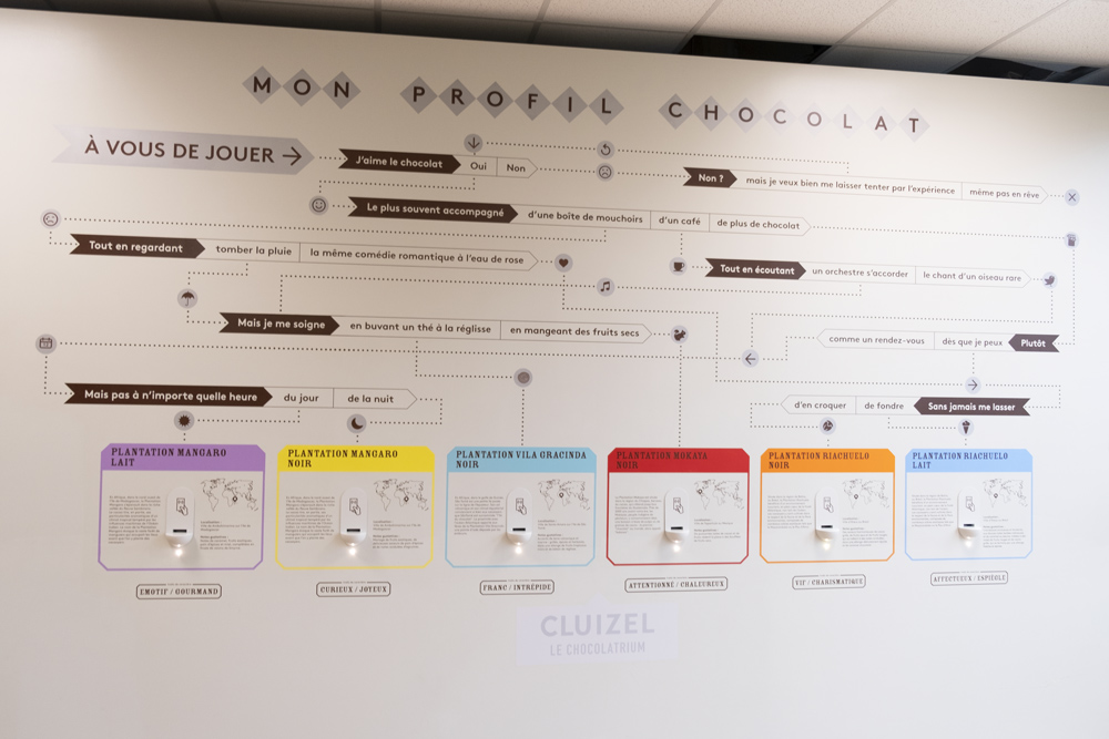 À la fin du parcours, un jeu ludique intitulé « profil chocolat » ravira petits et grands : en répondant à un enchaînement de questions, vous déterminez votre « profil chocolat », auquel une plantation et un trait de caractère sont associés (on vous explique un peu plus bas la notion de « plantation »). Une fois votre profil défini, vous n’avez plus qu’à scanner une carte magnétique qui vous sera remise au début de la visite et qui permet de délivrer un carré de chocolat choisit sur-mesure, suivant à vos réponses.