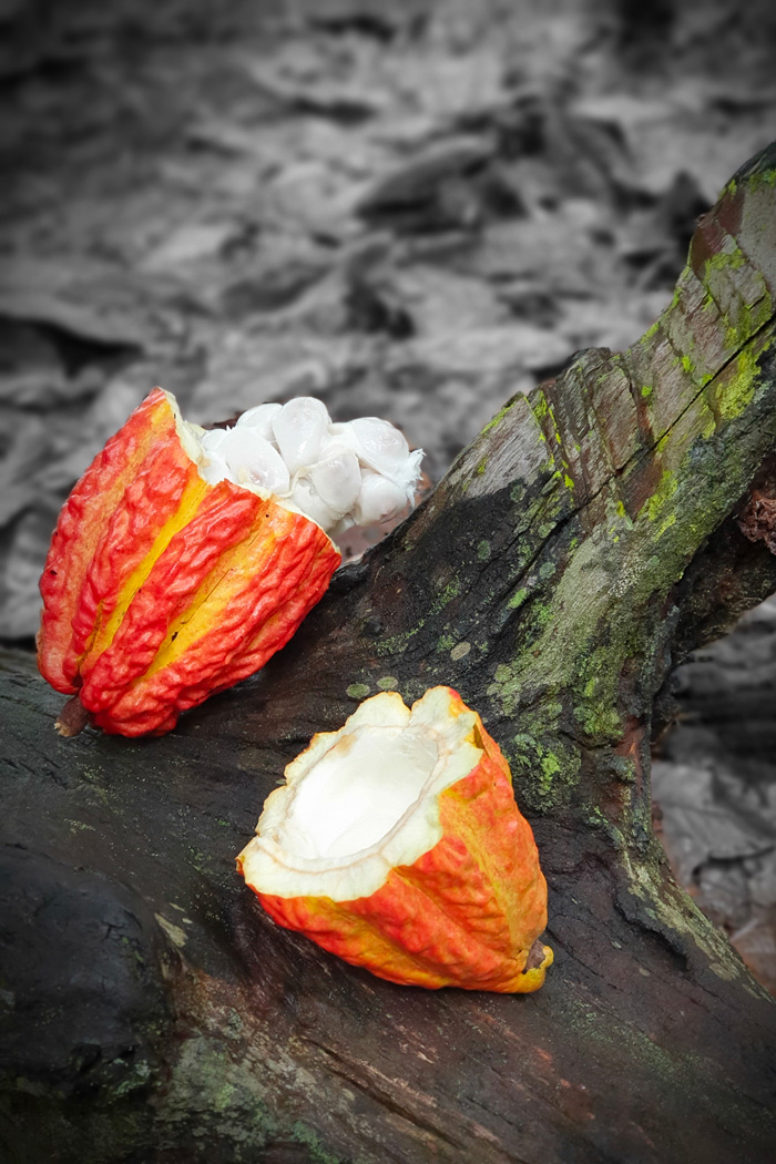 La saviez-vous ? La cabosse pousse à même le tronc du cacaoyer ! Quant à ce dernier, il grandit à l’ombre, à l’abri du soleil.