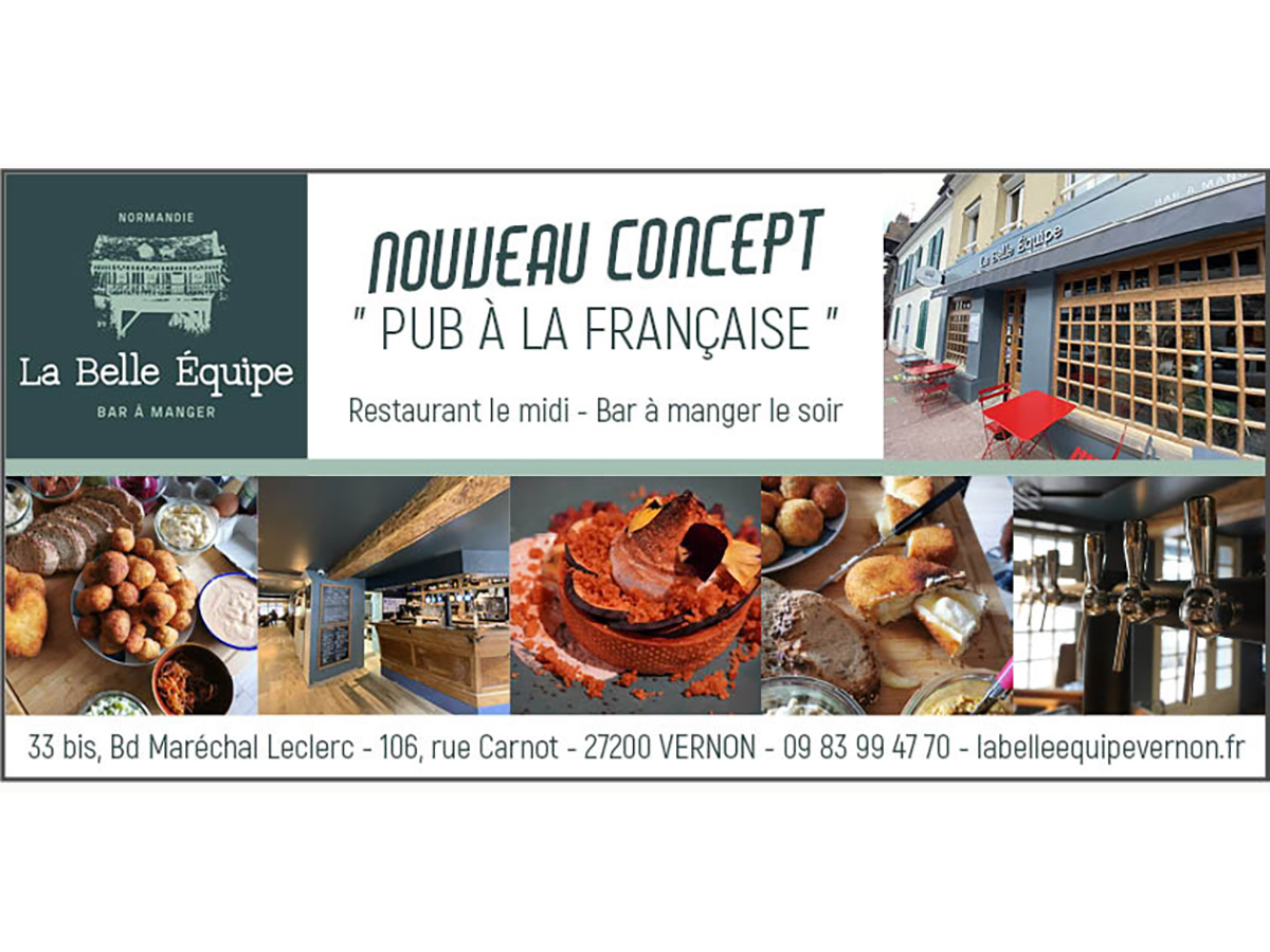 Frais, local et convivial ! C’est l’histoire d’une bande d’amis vernonnais qui décide de créer le lieu convivial, authentique et chaleureux qui manque depuis trop longtemps à leur ville natale. En bord de Seine, un authentique restaurant le midi et bar à manger le soir, valorisant nos spécialités normandes à boire et à manger, avec des produits frais et locaux en circuit court, où tout est bon et fait maison ! Un lieu d’échange, de rencontre et de découverte qui participe à promouvoir la culture locale et un certain art de vivre... à la normande ! Un concept fédérateur qui n’attend plus que vous ! Alors, on se retrouve à La Belle Equipe ?